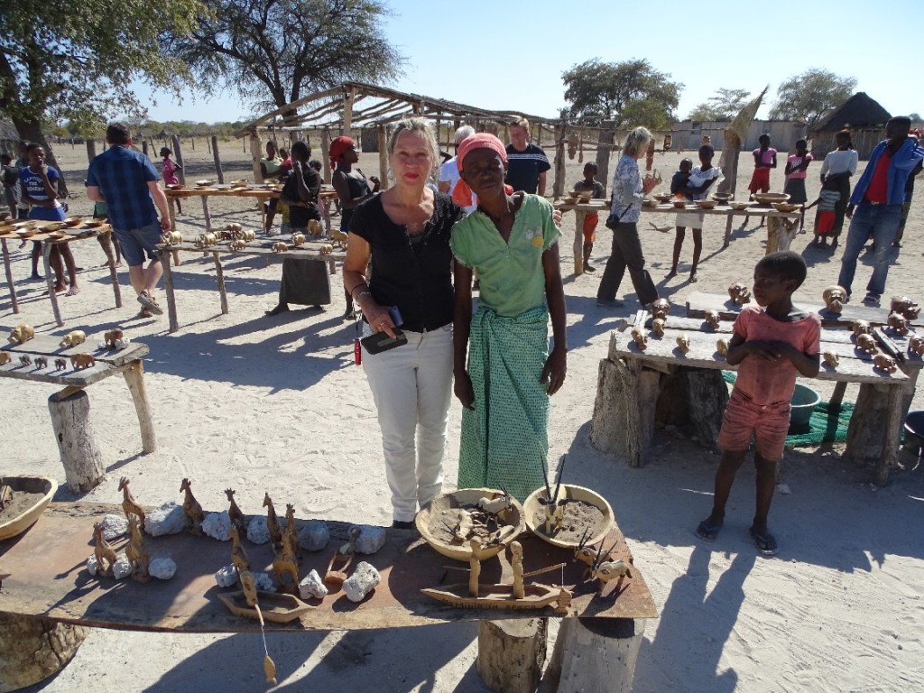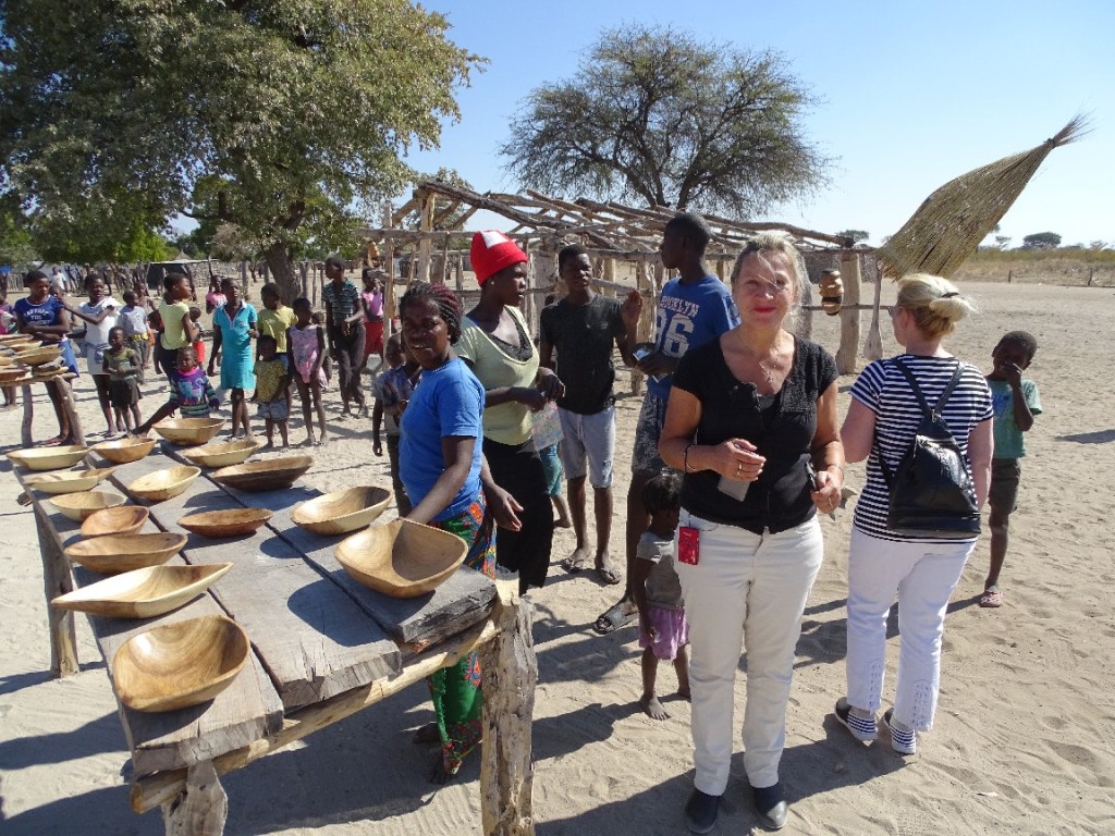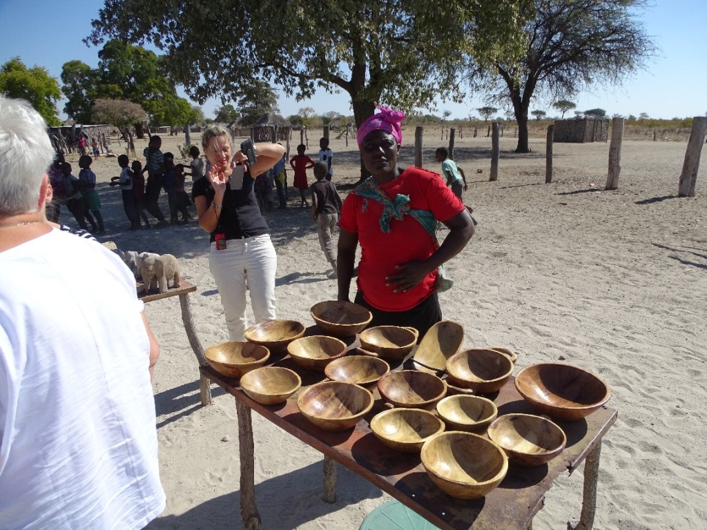 Es werden schön gearbeitetes Holzgeschirr, geschnitzte Erdmännchen, sowie Elefanten in allen Größen feilgeboten. Wir handeln uns ein Schälchen und ein paar hölzerne Oryxantilopen ein.