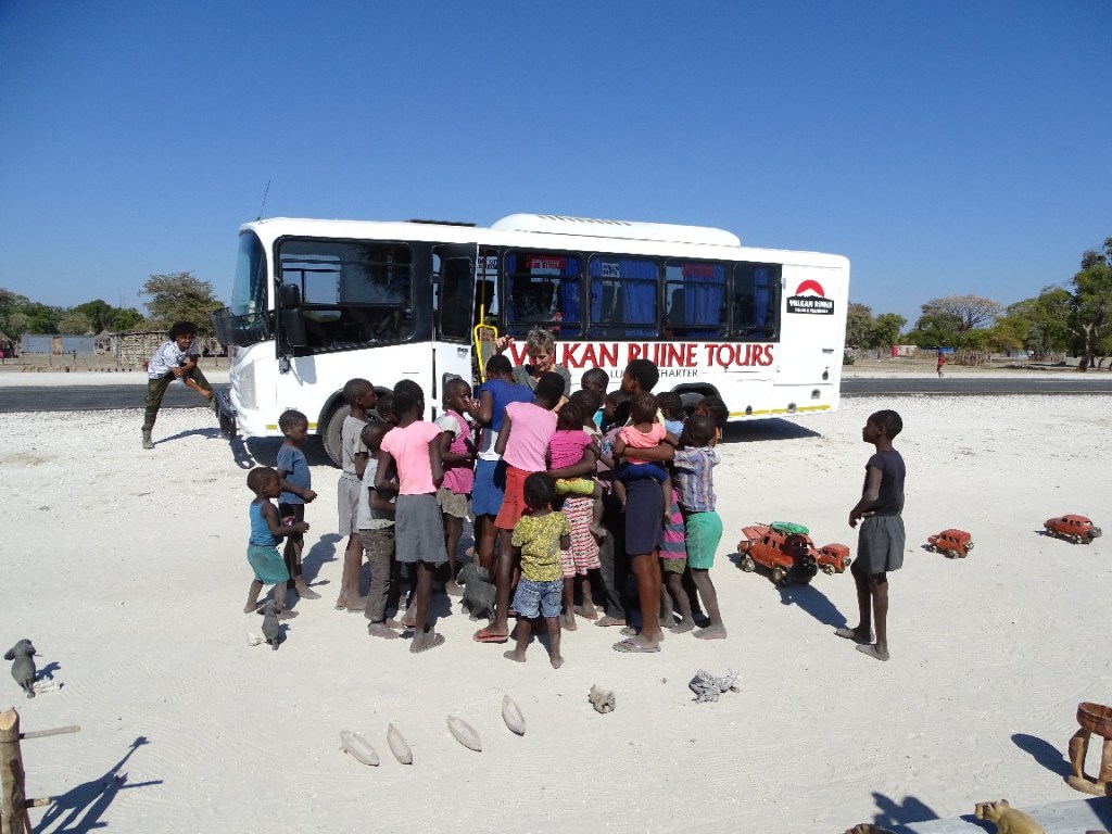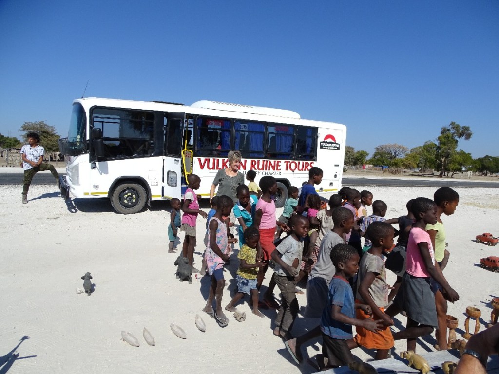 Annette fällt auf, dass es hier sehr viele Kinder gibt, die von sehr jungen Müttern auf dem Arm getragen werden. Heidrun kommt mit einer Tüte Süßigkeiten aus dem Bus. Sofort bildet sich eine Traube fröhlicher Schreihälse um sie herum. Kaum ist die Packung leer, zerstreuen sich die Racker wieder in alle Winde.