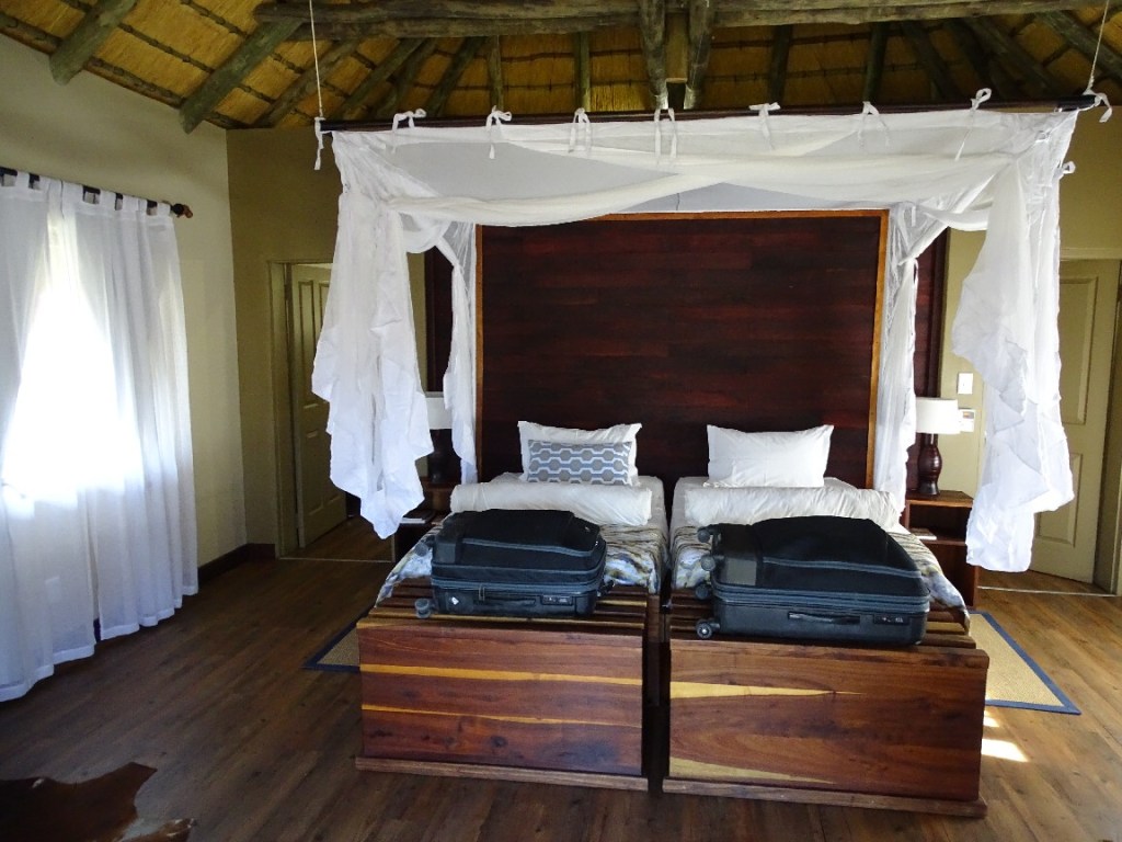 Wir beziehen ein kleines gemütliches Bungalow mit Reetdach und einer Veranda zum Fluss hin. Schade, dass wir hier nur eine Nacht bleiben werden. Nach der anstrengenden Fahrt machen wir uns etwas frisch um uns dann auch gleich schon ins nächste Abenteuer zu stürzen: Eine Bootsfahrt auf dem Okavango steht an.
