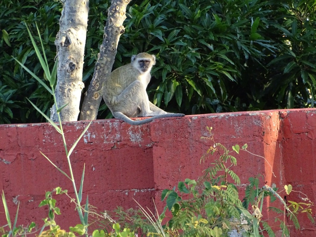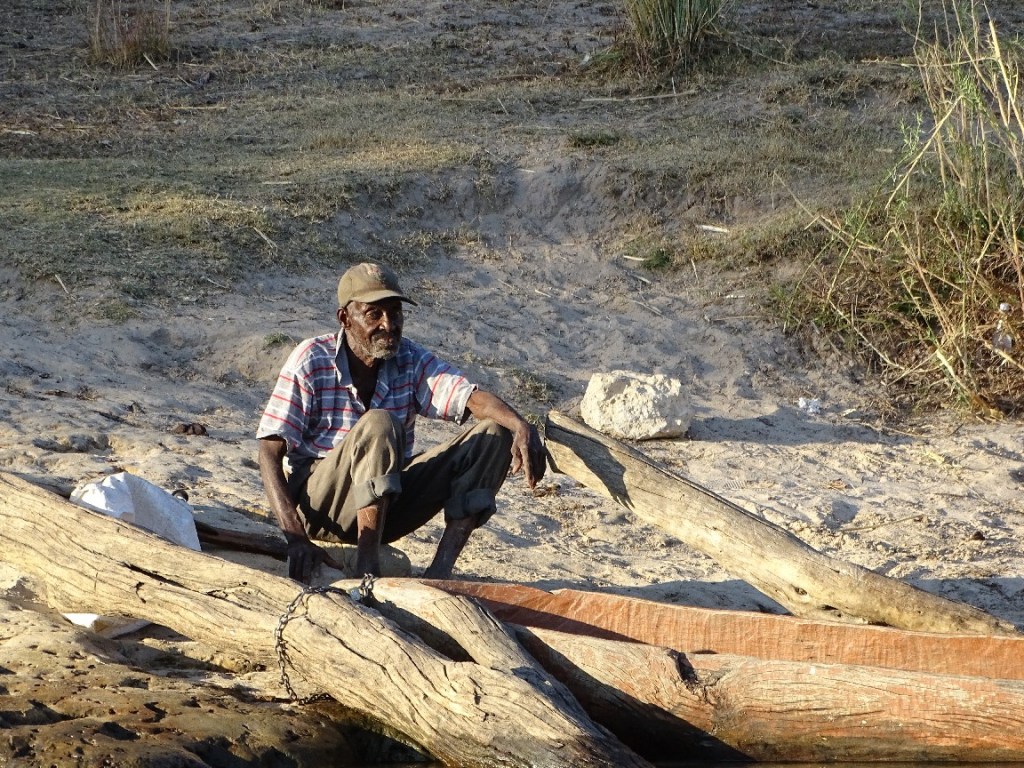 Wir legen ab und fahren eine Weile flussabwärts, Angola auf der Backbordseite und Namibia auf der Steuerbordseite. Einbäume liegen am angolanischen Ufer, ein Affe beobachtet uns von der anderen Seite. Über uns im Geäst sitzt ein Kranich.