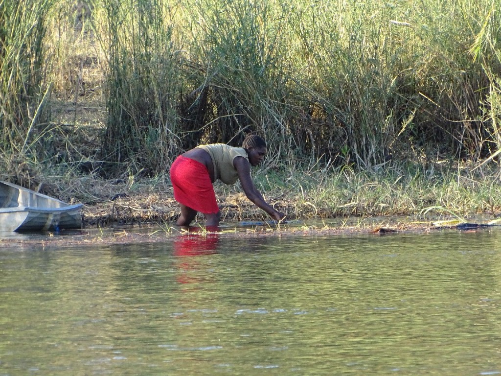 Wir befinden uns im Ovamboland. Der Fluss Okavango bildet hier die natürliche Grenze zu Angola im Norden. Unsere schöne Anlage befindet sich direkt am Ufer. Auf der anderen Seite des Stroms sind ein paar Einheimische bei der Abendtoilette oder beim Reinigen des Geschirrs.