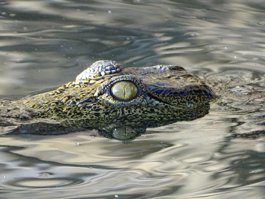 Krokodile! Eines liegt längsseits von uns ruhig im Wasser und man sieht nur die Augen, die uns fest im Blick haben. Ein anderes liegt am Ufer und döst friedlich in der untergehenden Sonne. Als wir näher kommen, geht ein grünes Auge auf. „Mag jemand ein Bad nehmen?“ ruft einer. „Geh vor! Ich komme nach!“ kommt die Antwort. Allgemeines Gelächter ist die Reaktion.