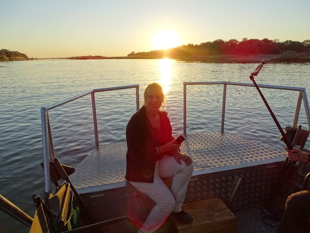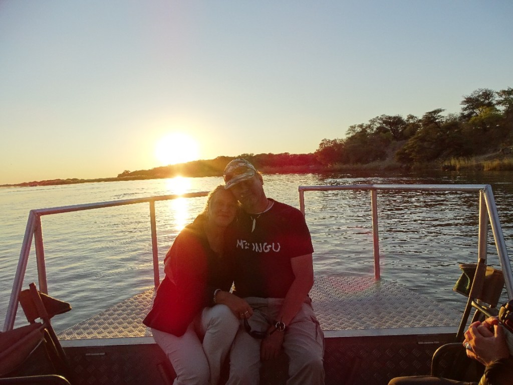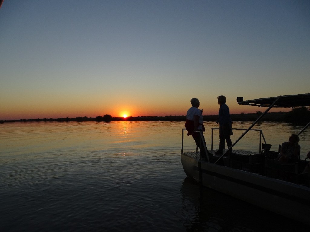 Bevor wir die Rückfahrt antreten, suchen wir uns eine schöne Stelle auf dem Fluss, von der aus wir den Moment beobachten wollen, an dem die untergehende Sonne die spiegelglatte Oberfläche des Okavango küsst um dann verlöschend in ihren Fluten einzutauchen (An diesem Satz habe ich lange gefeilt!).
