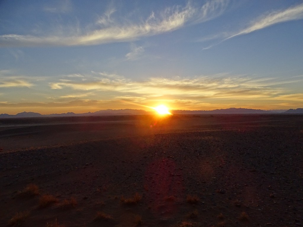 Jeder hält seine Kamera bereit, denn schon steigt die Sonne hinter einer Hügelkette langsam auf. Man hört das Sirren und Klicken vieler Fotoapparate. Das Licht der Sonne taucht den Wüstensand in die schönsten Rottöne. In der Ferne erscheinen immer mehr Geländewagen, die Einlass in den Park begehren.