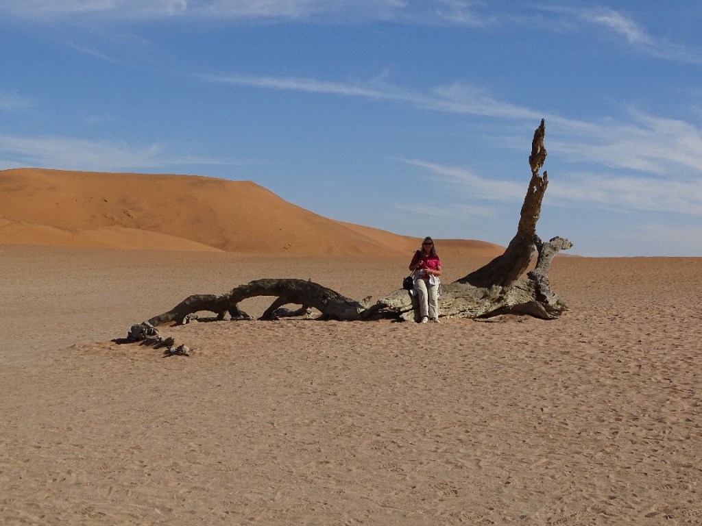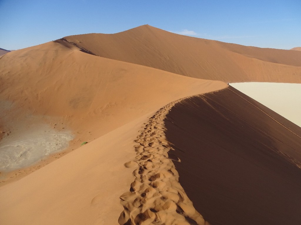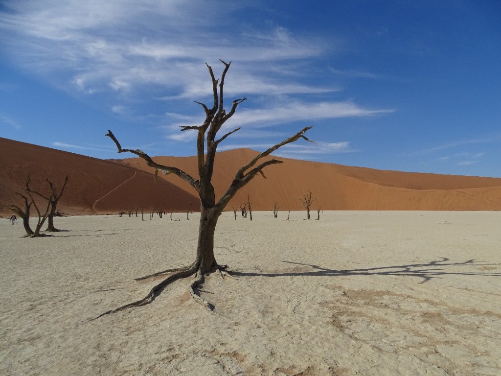 Wir beginnen unseren Abstieg in eine Lehmsenke mit dem Namen Deadvlei. Das Besondere daran ist, dass hier längst abgestorbene Kameldornbäume stehen, die aufgrund der Trockenheit nicht verwesen oder verrotten können. Es wirkt schon ein bisschen bizarr wie die Bäume mit ihren verdorrten Ästen in den Himmel greifen. Die Farbkontraste tun ein übriges um diese Szenerie zu einem beliebten Fotomotiv zu machen. Die Bäume stehen auf einem weißen Tonboden, sind umringt von gelben und roten Sandbergen und darüber zeigt sich ein wolkenloser Himmel in seinem schönsten Blau.