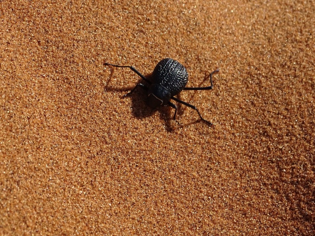 Endlich setzt sich der Konvoi vor uns in Bewegung und wir werden zum Einsteigen aufgefordert. Unverhofft wechselt der Straßenbelag von Schotter auf Asphalt. Links und rechts der Straße Dünenlandschaft. „Je höher der Eisenoxid-Gehalt im Sand ist, desto älter und roter ist die Düne.“ erklärt uns Luther. Aber auch der Einfallswinkel der Sonnenstrahlen verändert die Farbtöne, ergänze ich in Gedanken.