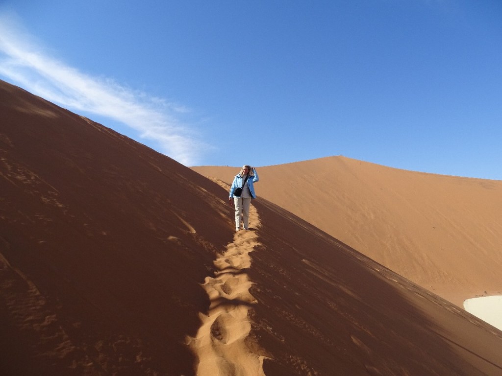 Eine zweistündige Wanderung auf dem Kamm des Sandberges steht uns bevor. Es geht gemächlich voran. Immer zwei Schritte vor und einen zurück. Einige aus der Reisegruppe beschließen den Aufstieg barfuß anzugehen. Es ist noch recht früh am Morgen und der Sand ist noch nicht so heiß. Rasch füllen sich unsere Schuhe und Strümpfe mit feingemahlenem Quarz und wir beginnen die Vorzüge des Barfuß-Laufens zu verstehen.