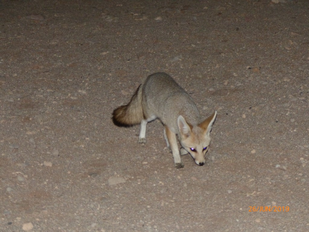 Wir kriegen das heute ohne Grillfleisch hin. Unsere Freunde erwarten uns schon mit einem gedeckten Tisch. Während wir an Keksen und Trockenfleisch knabbern, starren uns aus der Dunkelheit ein paar leuchtende Augen an. „Ein Fennek!“ ruft Walter und kramt nach seinem Fotoapparat. Die großen Ohren des kleinen Raubtiers erinnern tatsächlich an den nordafrikanischen Wüstenfuchs, aber ich glaube wir haben es mit einem Kapfuchs zu tun.
